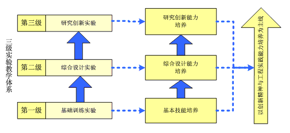 第一级:基础训练,通过大量验证型实验教学,使学生加深理解电工电子类基本理论知识,掌握调试软硬件的方法和技能,逐步培养学生分析问题,解决问题的实验能力。