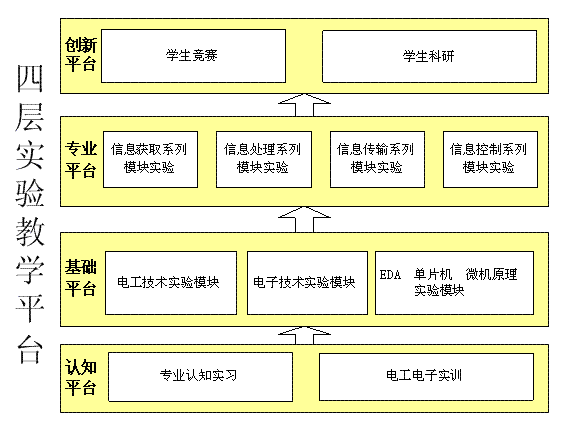 四层平台:认知平台、基础平台、专业平台、创新平台。针对不同学生的个性需求,提供模块化的实验、实践项目。